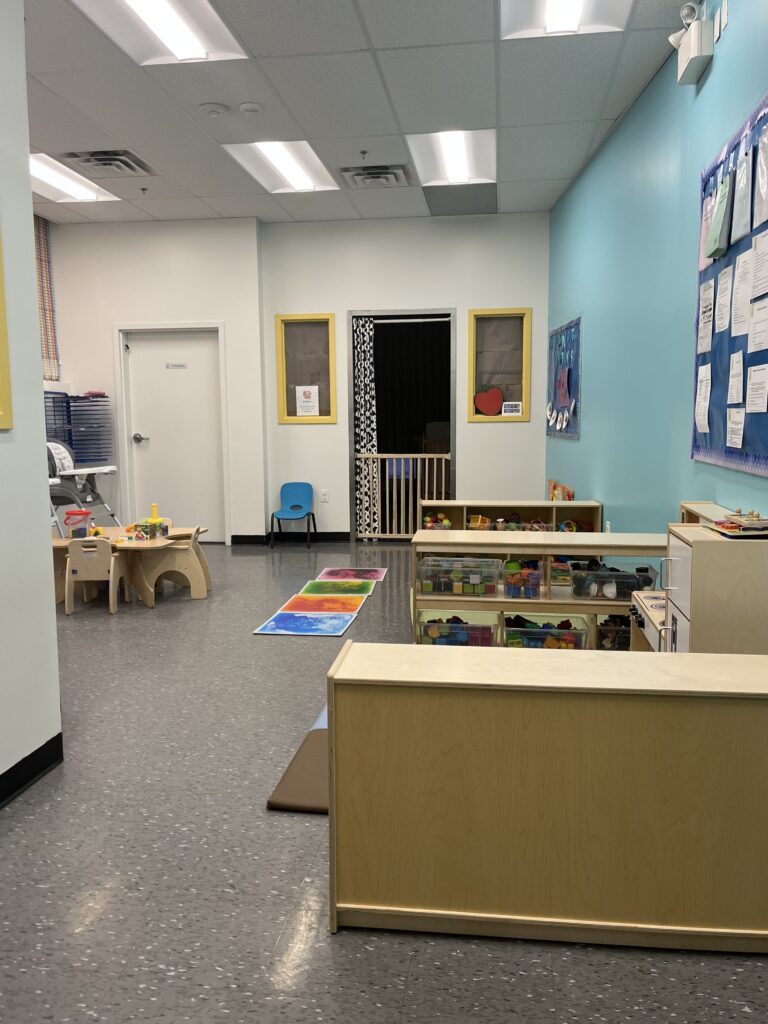 Families enjoy the bright classrooms with large windows and the spacious outdoor area that includes an infant playground and separate toddler and preschool spaces, each with age-appropriate structures and toys.