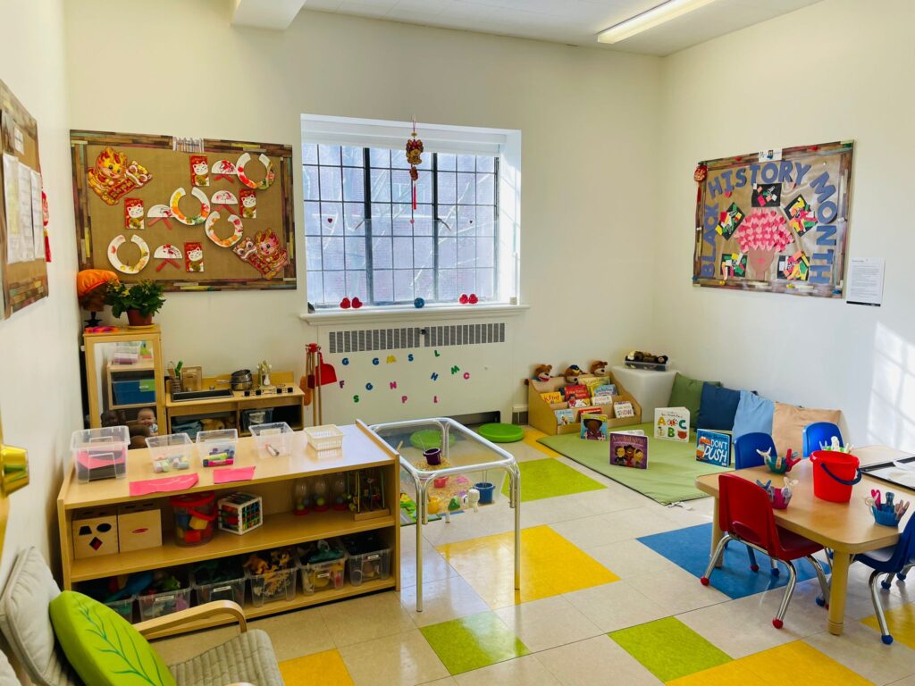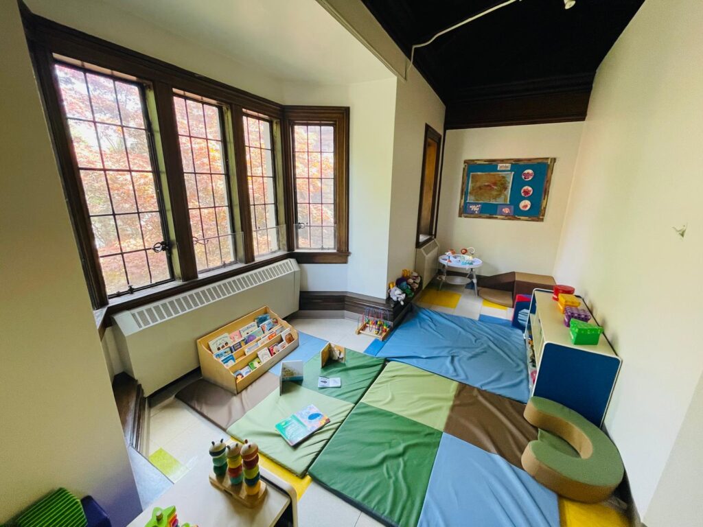 Families enjoy the beautifully treed outdoor area, which includes private playgrounds in both the front and back of the building for safe and engaging outdoor play.