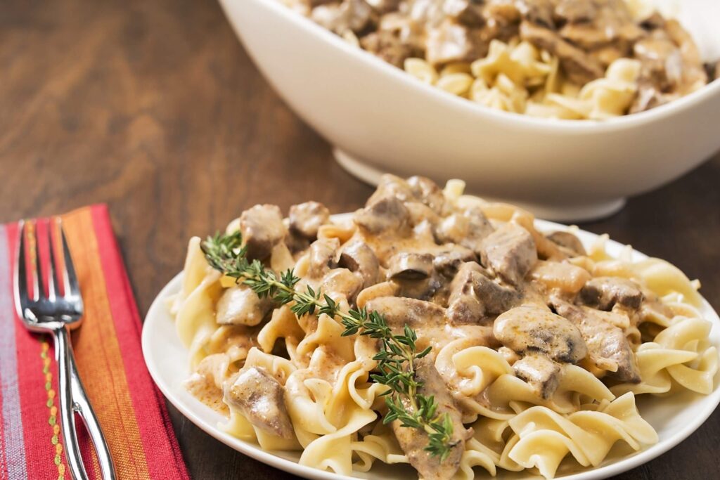 - Add mustard, cooked beef, cream and beef stock. Cook for 5-10 minutes.