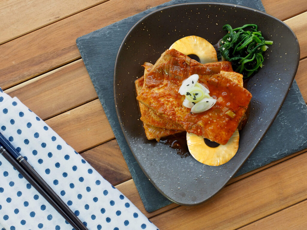- In a large skillet heat veggie oil over medium heat. Add onions, remaining garlic and cook until translucent. Add tofu fillets and all remaining ingredients and simmer sauce for 30 minutes.