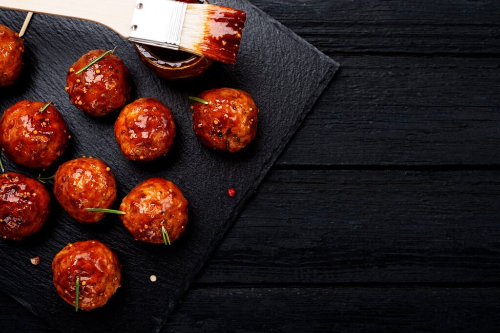 - Roll meat into small golf ball sized meatballs. Place about 1 inch apart on a parchment lined baking dish.