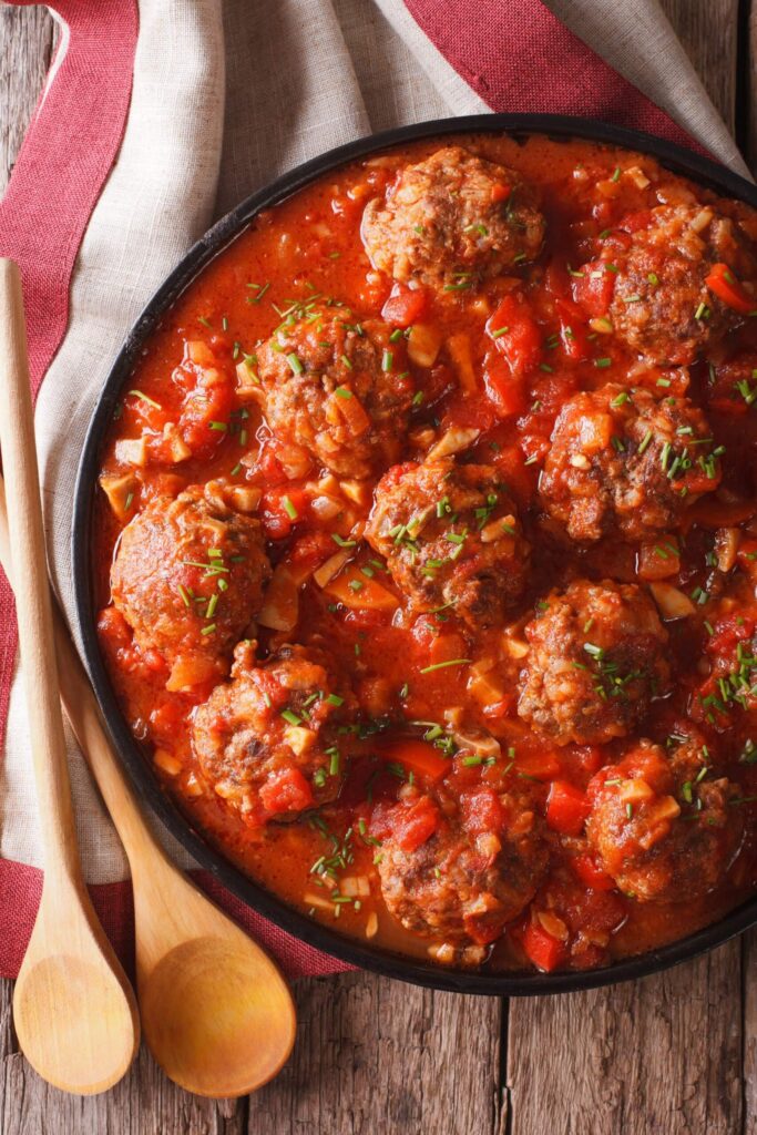 - Pour the sauce into a pan and stir in veggie meatballs, simmer until meatballs are heated through.