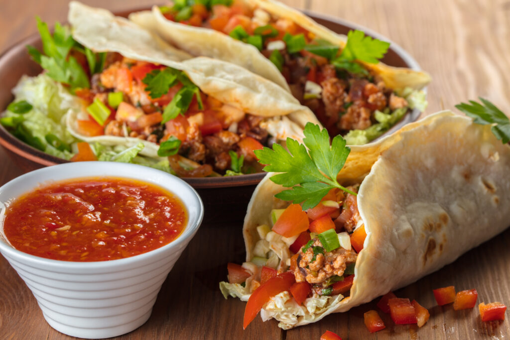 - Place taco mixture on whole wheat tortillas and top with shredded cheese and your option of sour cream, salsa, or any other toppings you desire.