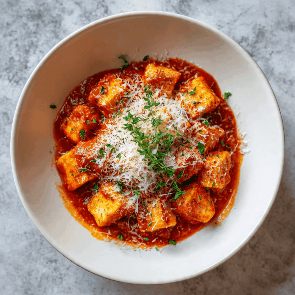 - Bake uncovered for 20–25 min, until tofu is heated through and edges are lightly golden.