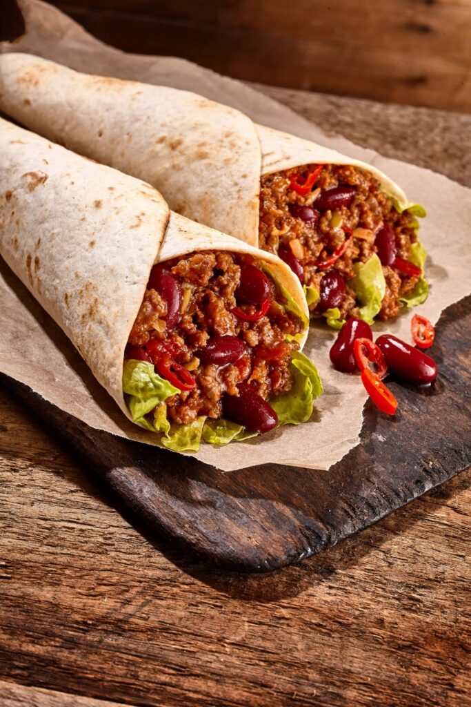Burritos are traditionally served on a flour tortilla. In our recipe we use a corn tortilla for a lighter gluten-free option. The word burrito means “little donkey”. The name burrito, when referring to the dish, derives from the appearance of bedrolls and packs like the ones donkeys carried.