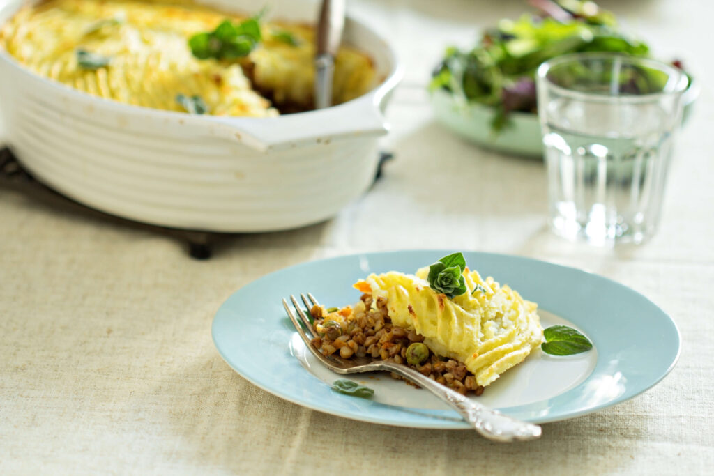 - Spread ground veggie mixture on the bottom of a baking dish. Spread a layer of mashed potatoes on top.
