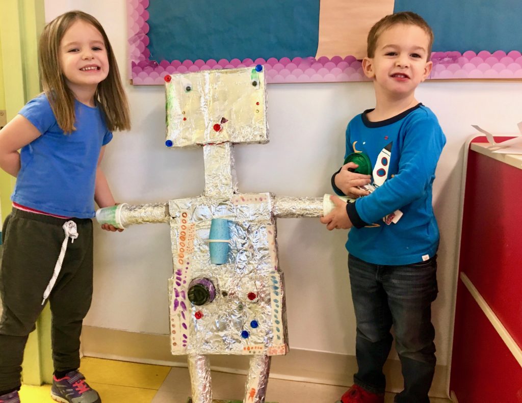 - In my five-year-old’s class, discussions arose about the difference between living things and non-living things – and with that, a series of learning opportunities emerged for the teachers to help the children explore. They shared their experiences and observations and came to various conclusions. To test one of the theories, the children decided to build their own robot to help determine if it was indeed a living thing. They brainstormed the types of materials needed and how they would construct it. They were so excited, they spent several days working on their project. There was a lot of pride in the finished piece and it prompted the realization that they could build other ‘life-like’ creations using unexpected materials. This resulted in the creation of a child-sized wooden-block Santa Claus. Although, the robot and Santa were amazing to see as a parent, both the teacher and I knew the journey to get there had been even more valuable. There were many discussions involving biology, lessons in collaboration and teamwork, planning and execution; which spanned all of the developmental domains.